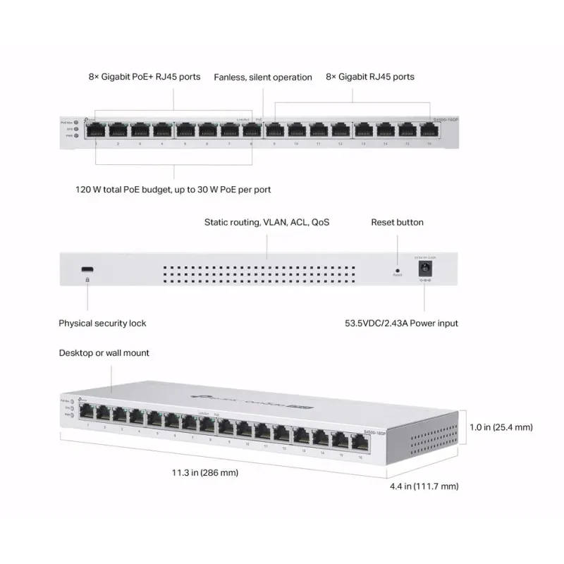 TP-Link S4500-16GP Omada Pro 16-Port Gigabit Smart Switch, 8-Port PoE+ ความเร็ว Gigabit, รองรับ ACL, VLAN 802.1q, LACP, DHCP Snooping รองรับการ Managed ผ่าน Omada Pro, POE 120W