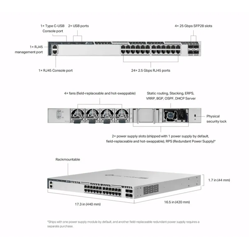 | Interface | • 24 × 100Mbps/1Gbps/2.5Gbps RJ45 Ports • 4× 1/10/25G SFP28 Slots** • 2× USB 2.0 Ports • 1× RJ45 Console Port • 1× USB Type-C Console Port • 1× RJ45 Management Port |