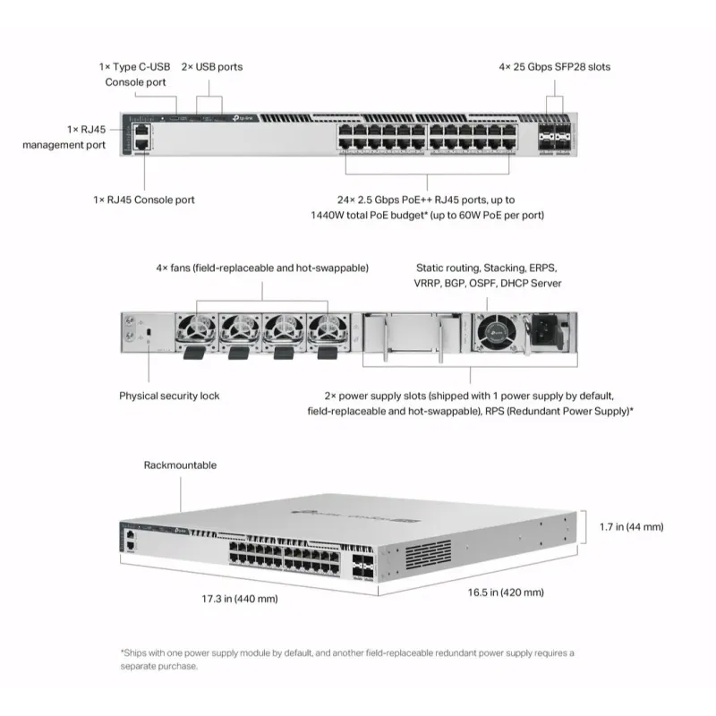 | Interface | • 24× 100Mbps/1Gbps/2.5Gbps PoE++ RJ45 Ports • 4× 1/10/25G SFP28 Slots*** • 2× USB 2.0 Ports • 1× RJ45 Console Port • 1× USB Type-C Console Port • 1× RJ45 Management Port |