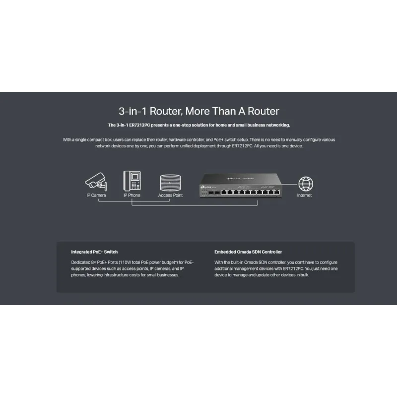 - 3-in-1 Router: Integrates router, PoE switch, and Omada controller altogether.