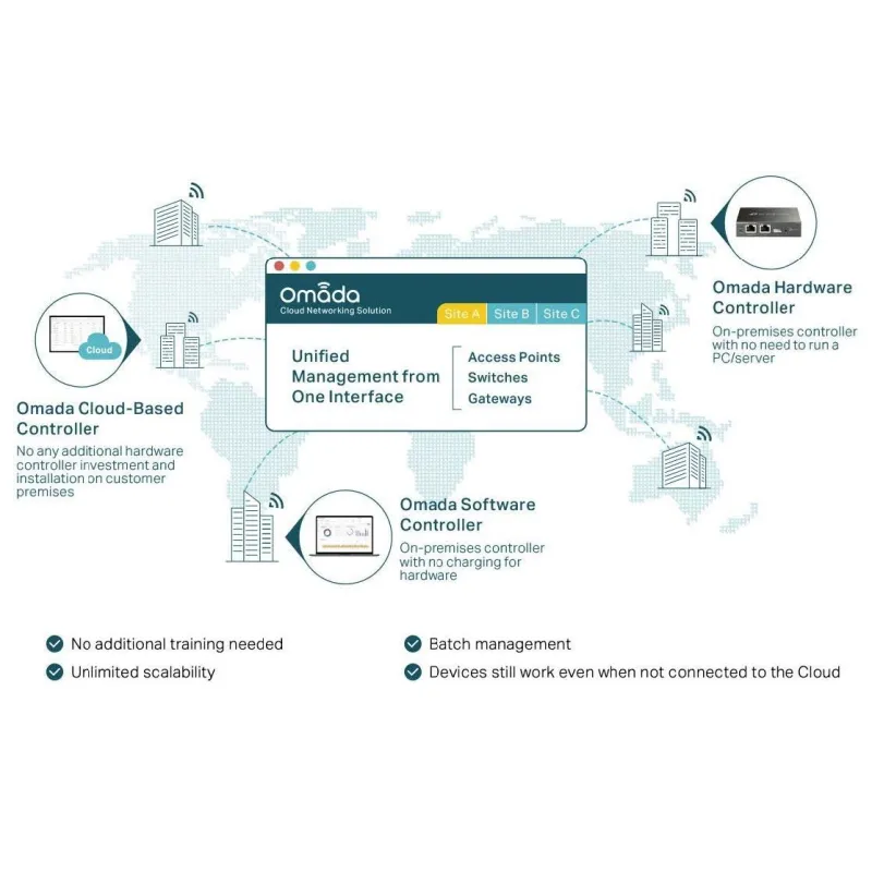 - Centralized management for up to 500 Omada access points, JetStream switches, and SafeStream routers.
