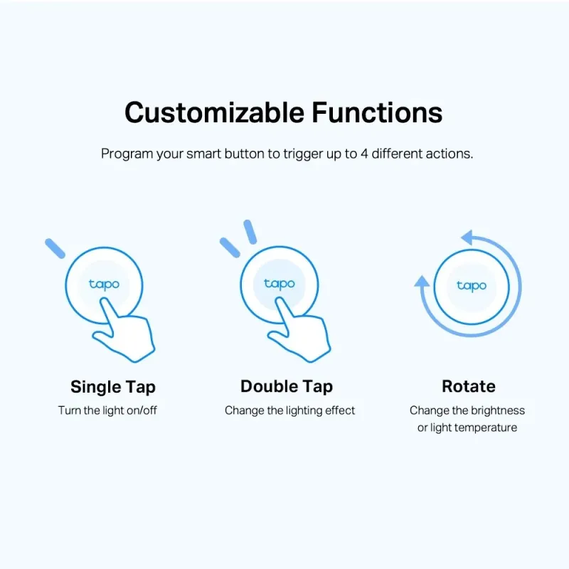 - Smart Actions – Control and set multiple lights, electronics, and other Tapo smart devices with the button.