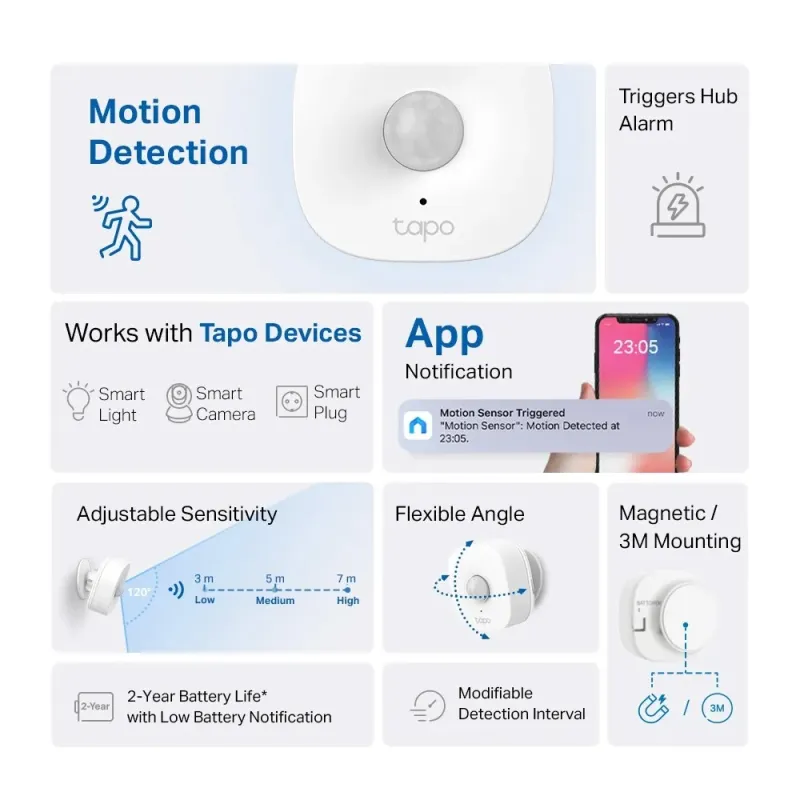 Overview | TP-LINK Tapo T100 Smart Motion Sensor อุปกรณ์ตรวจจับการเคลื่อนไหว เชื่อมต่อผ่านเครือข่ายไร้สายใช้ร่วมกับ Tapo Hub, Smart Lights, Smart Plugs, Smart Camera ใช้พลังงานต่ำ พร้อมแบตเตอรี่ CR20450 บริหารจัดการผ่าน Smartphone รองรับทั้ง iOS และ Android |