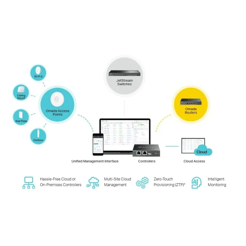 - Integrated into Omada SDN: Zero-Touch Provisioning (ZTP)*, Centralized Cloud Management, and Intelligent Monitoring.