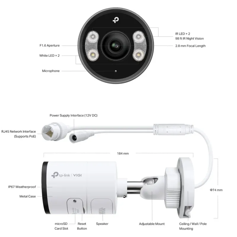 | Package Contents | • VIGI Network Camera • Quick Start Guide • Waterproof Cable Attachments • Mounting Accessories |