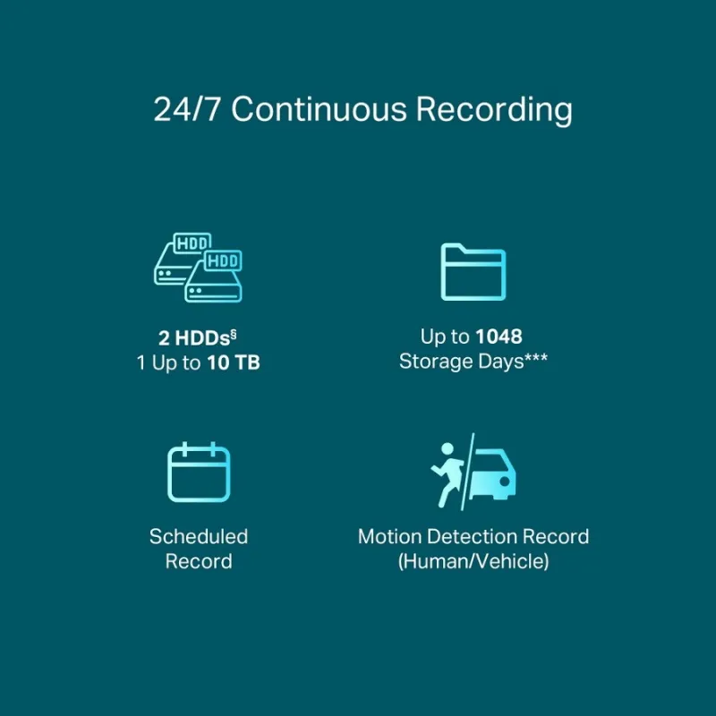 - 24/7 Continuous Recording: จัดเก็บข้อมูลไฟล์วิดีโอจากกล้องวงจรปิดที่เชื่อมต่อได้สูงถึง 32 TB (จัดเก็บได้ 1048 วัน***)เพื่อการเก็บรักษาข้อมูลอย่างรวดเร็วและความสะดวกสบายในการเข้าถึงข้อมูล