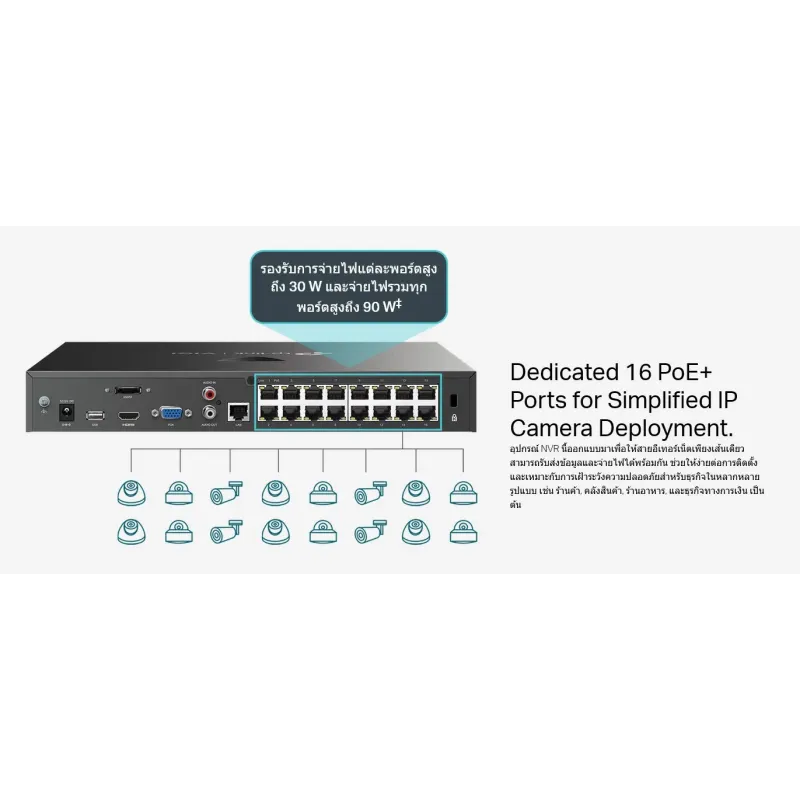 Overview | TP-Link VIGI NVR2016H-16P เครื่องบันทึก Network Video Recorder 16 Channel, 4K HDMI Video บันทึกมาตรฐาน H.265+ รองรับขนาด Haddisk สูงสุด HDD 2x16TB (32TB, Exclude HDD) จ่ายไฟ POE 16 Port ให้กับกล้อง สูงสุด 90W |