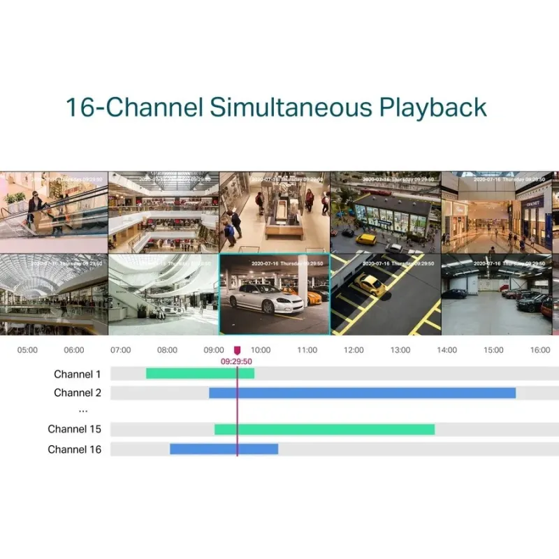 - 16-Channel Simultaneous Playback*: เล่นไฟล์วิดีโอย้อนหลังจากกล้องวงจรปิดได้ 16 ตัวพร้อมกัน เร่งความเร็วการเล่นภาพย้อนหลัง และค้นหาเหตุการณ์ในตารางเวลาเพื่อให้ง่ายต่อการตรวจสอบ