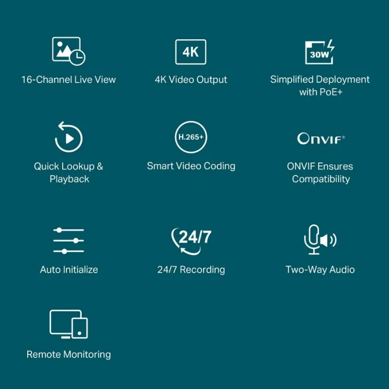 - 4K HDMI Video Output & 16MP Decoding Capacity: ภาพคมชัดสูงถึง 8MP และแสดงผลภาพกล้อง 2MP พร้อมกันได้ถึง 8-แชนเนล† ให้คุณได้ใช้งานสำหรับรับชมภาพสดและภาพย้อนหลังจากกล้องหลายตัวได้พร้อมกัน