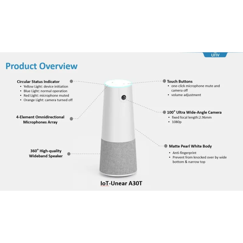 Overview | UNV IoT-Unear A30T All-In-One Video Conference Camera 1080p Full-HD 100 องศา ลำโพงเสียงรอบทิศทาง, ไมค์ 4 Element ระยะ 5 เมตร เชื่อมต่อเข้ากับ PC หรือ Notebook ผ่าน USB |