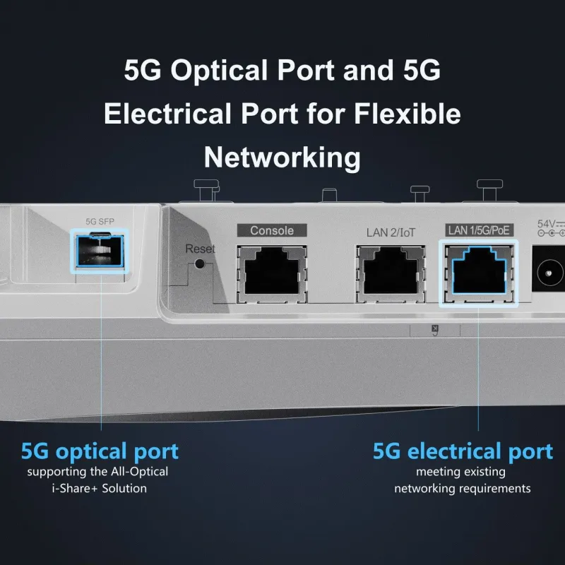 One 5G optical port supports higher bandwidth. With Ruijie All-Optical i-Share+ Solution, this port helps achieve all-optical gigabit access in rooms. One 5G electrical port is also provided to meet existing networking requirements.