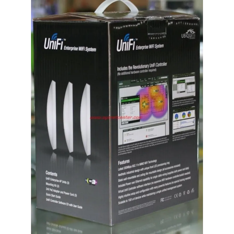 Overview | ถูกกว่าซื้อแยก !! อุปกรณ์สื่อสารไร้สาย Ubiquiti UniFi AP Pro แบบ Pack จำนวน 3 ชุด (Unifi-UAP-Pro Pack 3) กระจายสัญญาณได้ 2 ย่านความถี่ (Dual Band) 2.5GHz และ 5GHz ความเร็ว 300Mbps (2.4GHz) และ 450Mbps (5GHz) กำลังส่งสูงสุด 30 dBm (1000 mW) เสาอากาศขนาด 3dBi X 2ควบคุมการทำงานผ่าน Software UniFi Controller ช่วยให้การบำรุงรักษาอุปกรณ์ได้อย่างสะดวก รองรับ VLAN (802.1q) และ QOS |