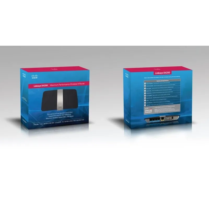อุปกรณ์ Broadband Router ไร้สาย Linksys E4200 ความเร็วสูง 300 Mbps ใช้งานได้พร้อมกันความถี่ 2.4/5 GHz พร้อมด้วย 4 พอร์ท Gigabit รับ-ส่ง ข้อมูลด้วยเทคโนโลยี 2T2R MIMO เพิ่มระยะทางไกลขึ้น 3 เท่า รองรับ Firmware DD-WRT พร้อมด้วยระบบ HotSpot รองรับ 10 Accounts?